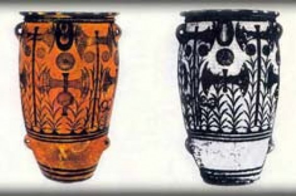 Πιθάρια με τους χαρακτηριστικούς μινωικούς λάβρυες ως διακοσμητικά, που βρέθηκαν μεταξύ άλλων στην Αμερικανική Ήπειρο